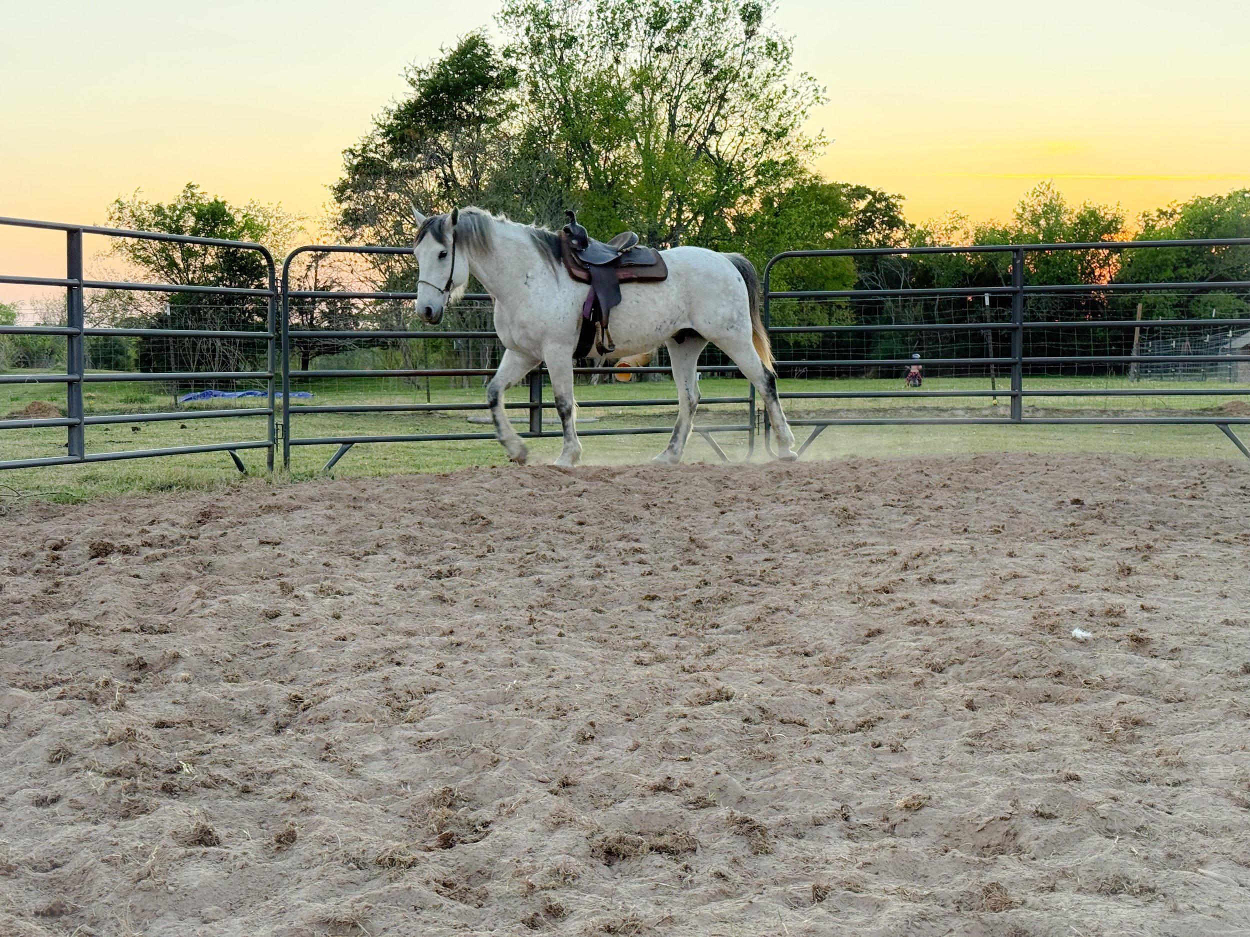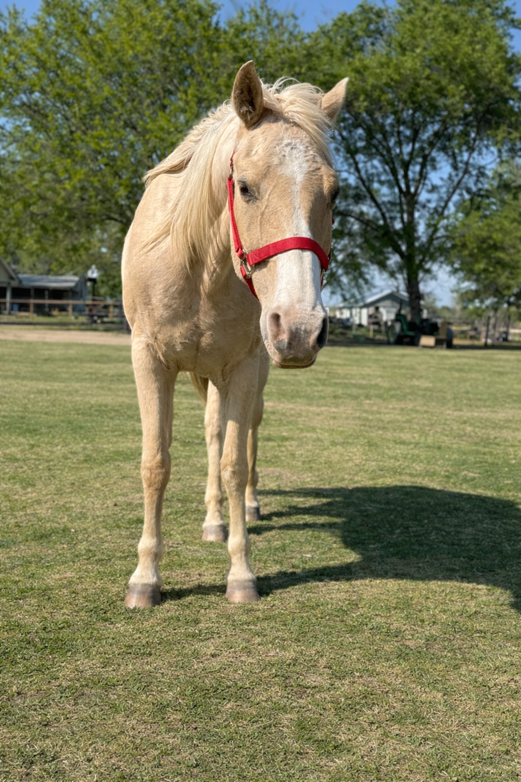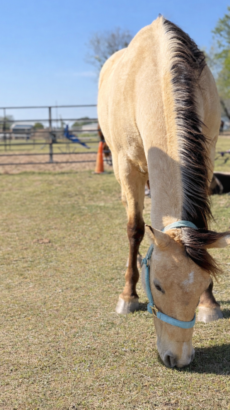 A stunning buckskin Quarter Horse with a big heart and even bigger talent. She’s a favorite for teaching kids the ropes and building confidence in the saddle. When she’s off the lesson schedule, you’ll find her flying around the barrels at rodeos across East Texas.