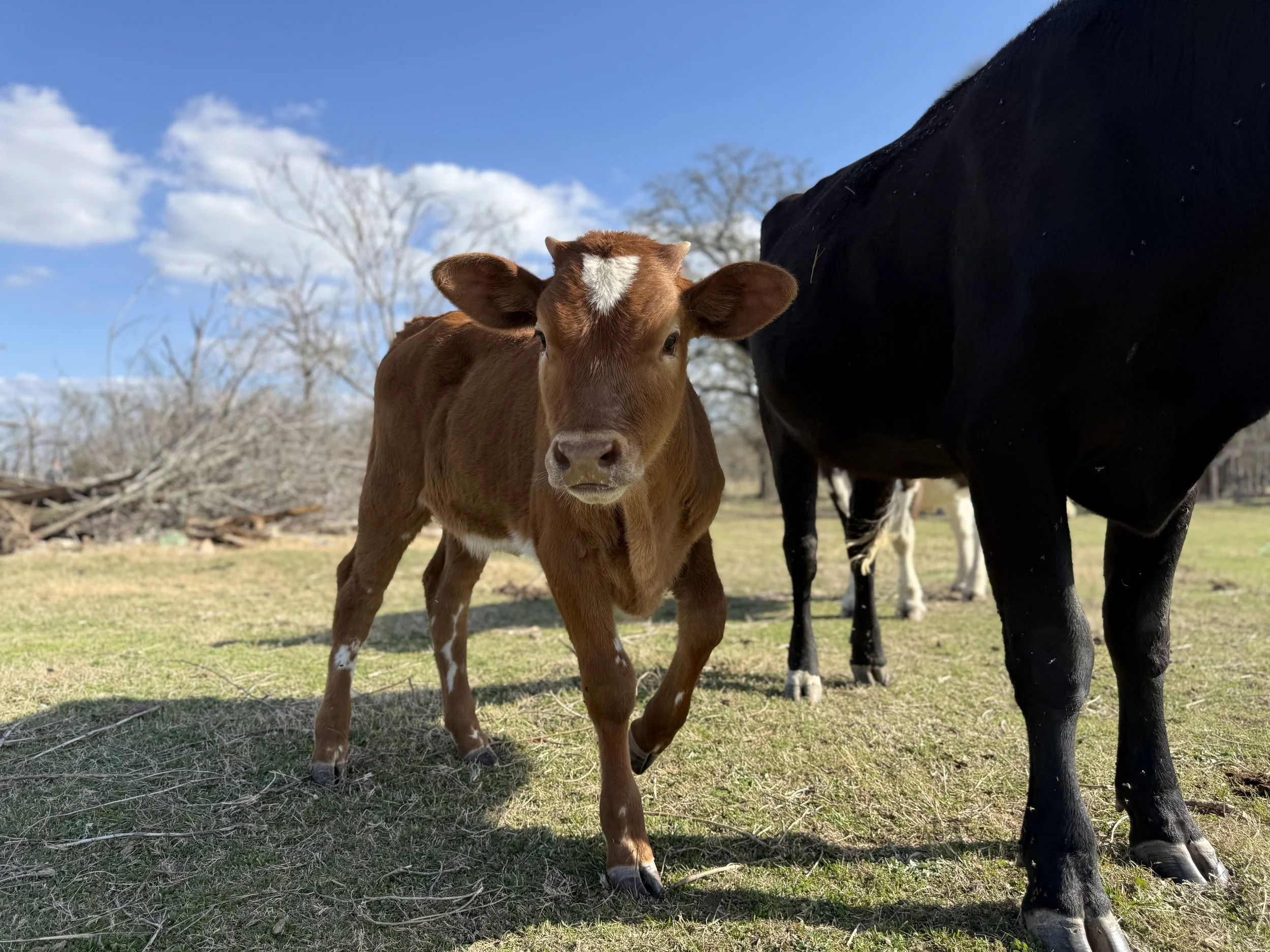 Mooana is our 4-month-old Longhorn/Angus cross. She was born to our Angus cow, Hyacinth, who we raised as a bottle baby. Mooana is sweet, curious, and full of energy. She loves her treats and never turns down a scoop of grain.
